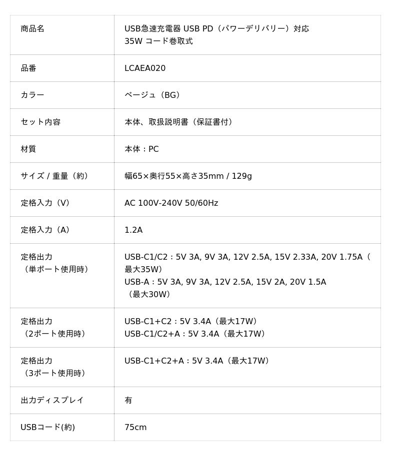 「USB急速充電器 USB PD(パワーデリバリー)対応 35W コード巻取式」LCAEA020