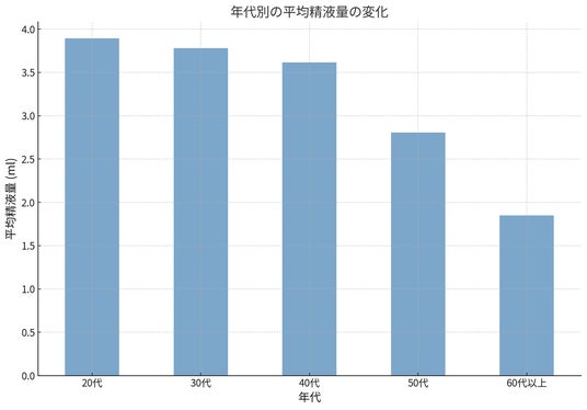 平均精液量は、年齢とともに少なくなっていくものの、40代までは比較的保たれているのが分かります。50代以降は、平均精液量が大きく落ち込み、60代では20代の半分近くまで数値が落ちています。
