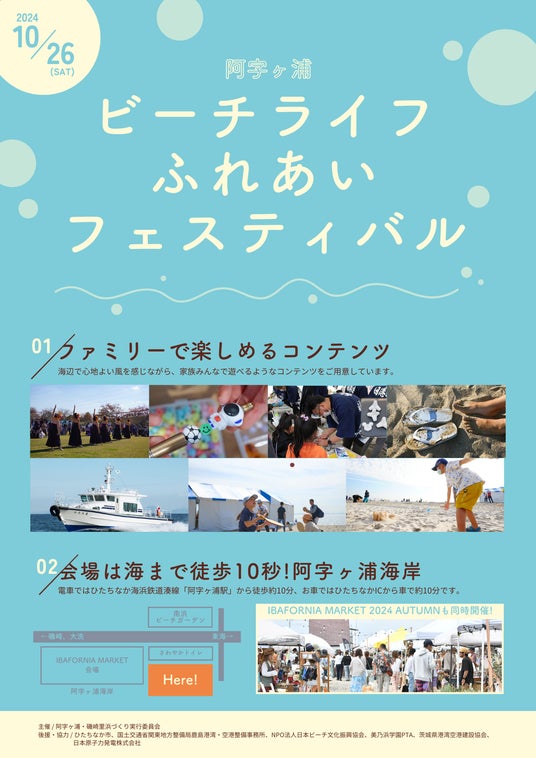 『第20回ビーチライフふれあいフェスティバル in 阿字ヶ浦2024』の主催は、阿字ヶ浦・磯崎里浜づくり実行委員会。茨城県ひたちなか市・阿字ヶ浦海岸を舞台に、午前10時30分から午後3時までビーサン跳ばし、ステージショー、宝探し、キッチンカーなども楽しむことができます。同会場における同日開催イベントとしては、『IBAFORNIA MARKET 2024 AUTUMN』も。17時からは「野外映画映」、19時からは「阿字ヶ浦海岸花火大会」も予定されており、ビーチ一文化を存分に堪能できる一日となりそうです。