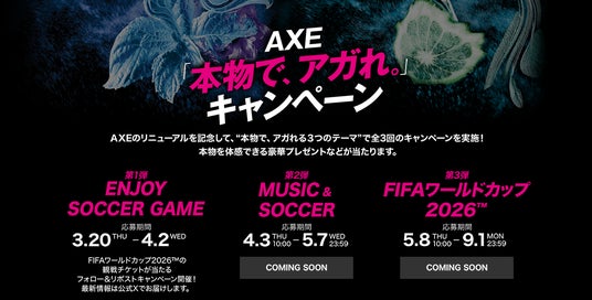 新製品の発売に合わせて “本物を体感できる”プレゼントが当たる「本物で、アガれ。」キャンペーンを全3回実施いたします。第1弾は2025年3月20日(木)~4月2日(水)にて、ワールドカップの観戦チケットが当たるフォロー&リポストキャンペーンを、公式Xにて(https://x.com/AxeJP)実施いたします。