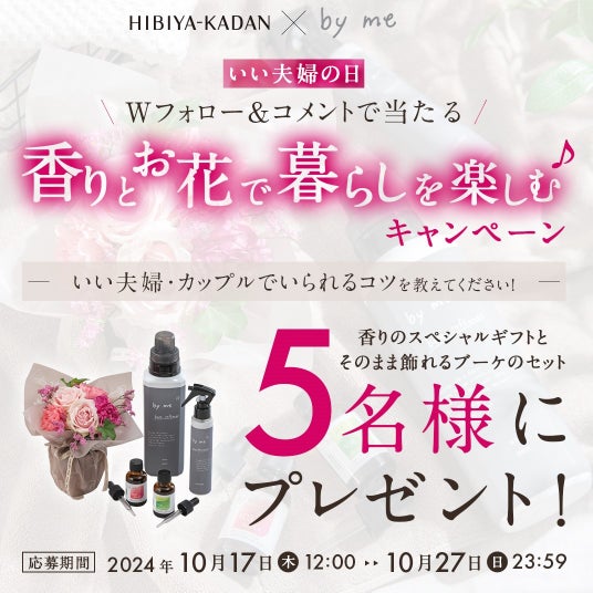 Instagramにて、日比谷花壇オンラインショップ公式アカウント(@hibiyakadan_onlineshop)と『by me』公式アカウント(@byme_official_jp)の両方をフォローのうえ、キャンペーン投稿に「いい夫婦・カップルでいられるコツ」をコメントいただいた方の中から、抽選で5名様に、『「by me」香りのスペシャルギフトとそのまま飾れるブーケのセット』をプレゼントします。