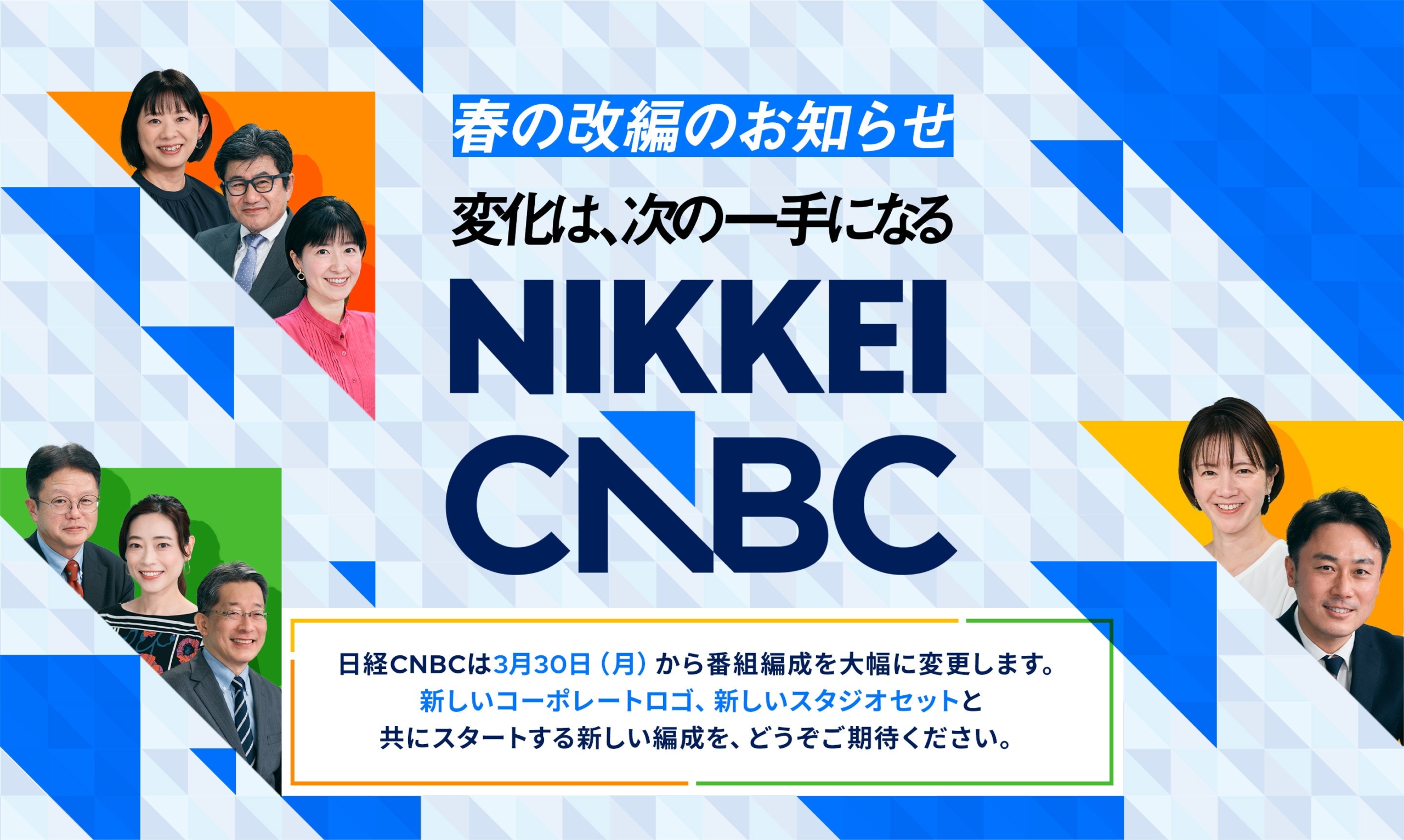 株式会社日経CNBC(本社:東京都千代田区、代表取締役社長:竹之内源市)は3月30日(月)から番組編成を大幅に変更します。新しいコーポレートロゴ、新しいスタジオセットと共にスタートする新しい編成を、どうぞご期待ください。