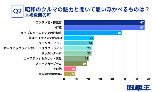 昭和のクルマの魅力と聞いて思い浮かべるものとして、最も多くの票を集めたのは「エンジン音・排気音」と「MT車」 でした。