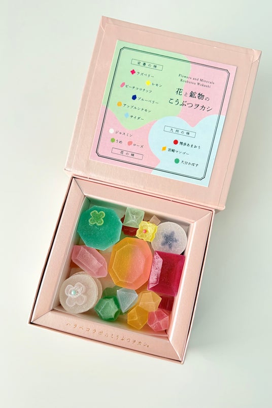 「花と鉱物のこうぶつヲカシ」は花の香りと鉱物の輝きを閉じ込めた、特別な琥珀糖。