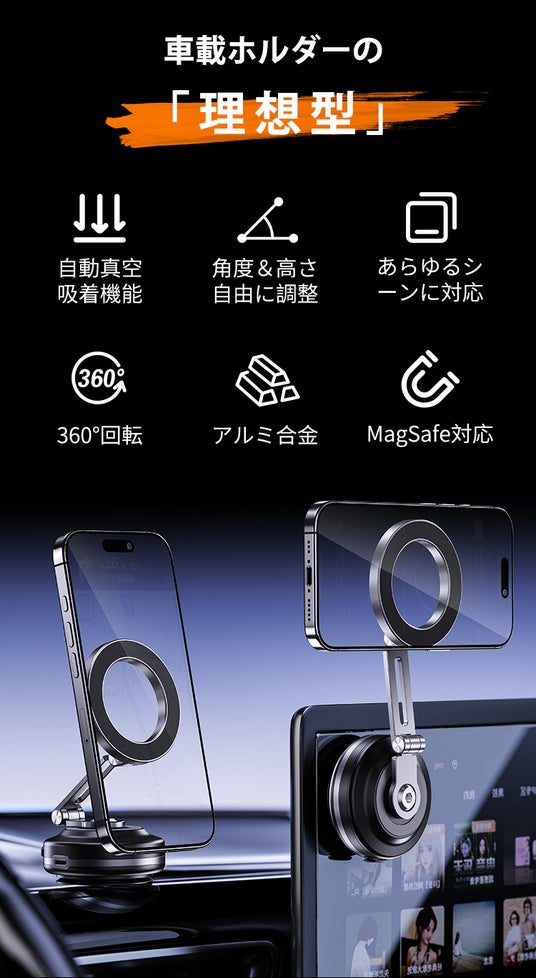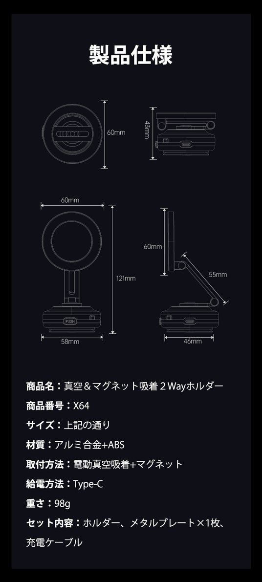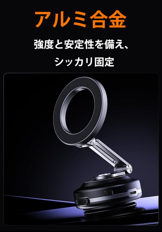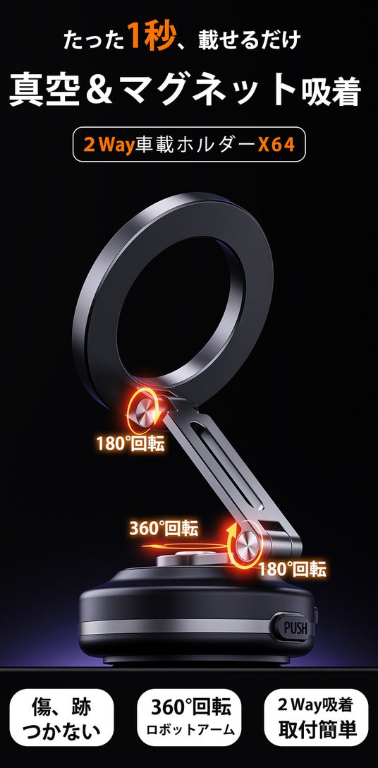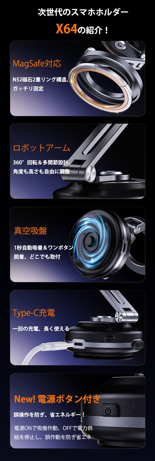 早期支援はさらに10%オフの限定クーポンが配布中!載せるだけ、1秒で真空&マグネット吸着!電源ボタン付きの車載ホルダーX64が登場