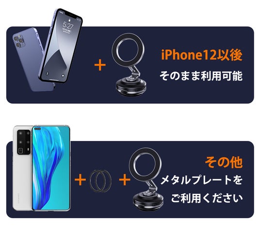 ※非MagSafe対応のスマートフォンやスマホケースには、メタルプレートをケースの外側に取り付ける必要があります。メタルプレートが1枚付属しています。