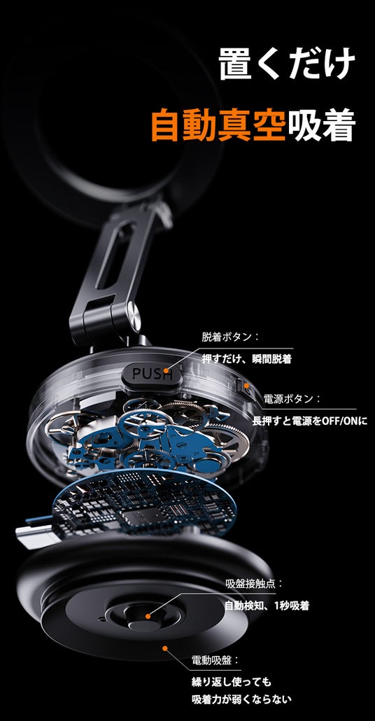 X64は、真空吸着技術を採用し、車やデスクにしっかりと固定できるホルダーです。 モーターの力で、わずか1秒で吸盤内部を真空状態に! 吸盤の突起部分が平らな面に触れると自動で感知し、瞬時に吸着して強力に固定されます。