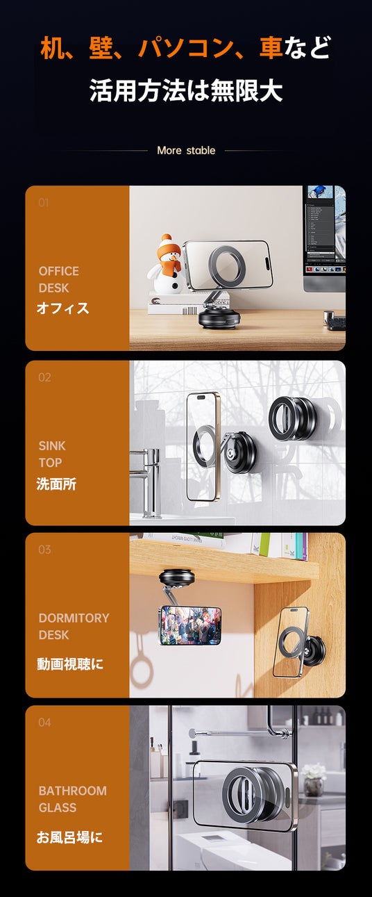 マグネットと真空吸着を組み合わせたスマートな設計により、跡を残さず、清潔で快適な使用が可能です。スマホやケースを傷つける心配もなく、平らな場所にスムーズに設置できます。この2WAY吸着スタンドは、机や壁、車、パソコンなど、あらゆる場所で簡単に固定でき、日常のさまざまなシーンで活躍します。