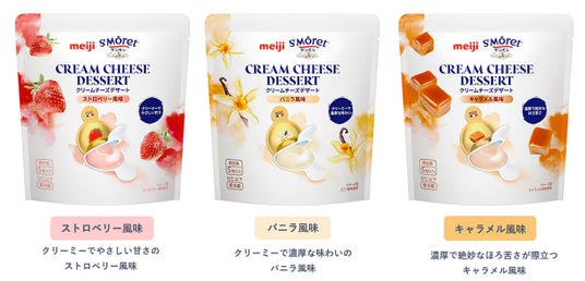 「明治サンモレクリームチーズデザート」は、フランス産の新鮮なクリームチーズを使用し、“なめらかでレアチーズケーキのような食感“と”日本人の味覚に合うやさしい甘さ“が特長のチーズスイーツです。商品は全3種類。