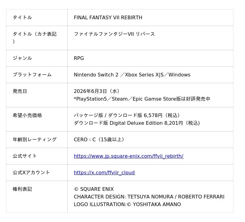 株式会社スクウェア・エニックス(本社:東京都新宿区、代表取締役社長:桐生 隆司、以下スクウェア・エニックス)は、Nintendo Switch 2 / Xbox Series X|S / Windows版『ファイナルファンタジーVII リバース』の発売日が2026年6月3日(水)に決定し、あわせてダウンロード版の早期購入で20%OFFとなるセールを開始したことをお知らせいたします。