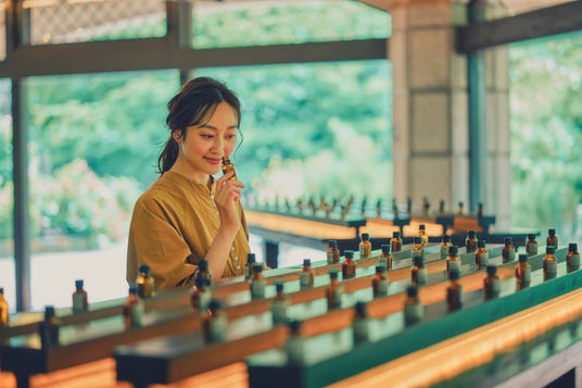 約80種の天然エッセンシャルオイルを展示。様々な香りに出合って好きな香りを探しませんか。神戸布引ハーブ園がおすすめする”暮らしに役立つ精油の活用術とブレンド術”の展示も人気です
