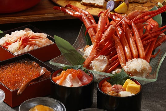 北海道直送のズワイ蟹、10種の具材から選べる海鮮丼、握りたて寿司など贅沢な料理が堪能できる