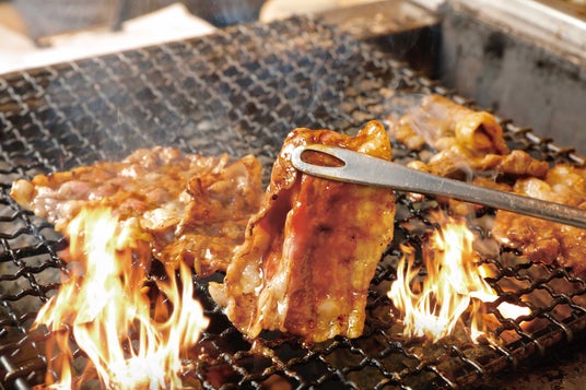 【こだわり3. 炭火仕上げ】肉の焼き方は、私たちのこだわり。遠赤外線でじっくり焼き上げます。焼肉はムラなく、炭の香りを纏わせています。炭火仕上げの肉の香ばしさをご堪能ください。