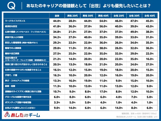 課長以上の役職者に、ご自身が部下を登用する際に出世に有利になると思う部下の行動を聞いたところ、1位「同僚や部下のサポートをする」34.8%、2位「自己分析・自己理解を深める」32.1%、3位「上司に教えを乞う・フィードバックをもらう」25.9%、4位「上司と共通の話題をつくる」24.1%でした。前問の、出世したいと思う方がやってみたことがあるものと上位の項目は同じであるものの順位が異なる結果となりました。上司は「同僚や部下のサポートをする」といった協調性や思いやりのある人物を登用したいと考え、普段から部下の行動をよく見ているのかもしれません。また出世したいと思う人は、ストレートに上司に教えてもらったりフィードバックしてもらうことが近道と言えそうです。 出世より優先したい「ワークライフバランス」、最も求める年代は40代。30代女性は「心身の健康」「自由な働き方」を望む。 Q. あなたのキャリア観として出世よりも優先したいことをお答えください。(複数回答、n=600)