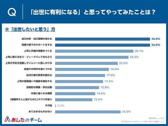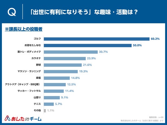 課長以上の役職者の回答でも、「ゴルフ」60.2%、「お酒をたしなむ」50.0%となり、出世における「ゴルフ」と「お酒」の強さが判明しました。ゴルフとお酒に共通するのは、4人前後の人数でコミュニケーションできることと、ビジネスの場ではわからない人柄が見えることでしょうか。上司や取引先の人がゴルフやお酒が好きな場合、誘われやすくなり、キーマンと距離が縮まるきっかけになることもあるかもしれません。 Q. あなたが「出世に有利になる」と思ってやってみたことがあるものをお答えください。 (複数回答、n=285) ※「出世したいと思う」と回答した方