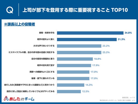 前問の「出世が早い人の特徴」では、「相手の話をよく聞く」は5位、「大きな声であいさつをする」はTOP10圏外(12位)でしたが、実際に部下を登用する際の重要度として聞くとランキング順位が大きく上がりました。1位の「時間・約束を守る」を含め、社会人として基本的なことだからこそ、それをしっかりできている人を登用したいと考えるのかもしれません。同率3位の「ミスやトラブルの際、自分の非を認め迅速に対応する」のように、隠し事をしないことや誠実さも、出世するために重要と考えられているようです。