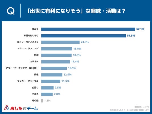 一方、前問の「出世が早い人の特徴」で2位の「上司に気に入られている」はTOP10圏外(13位、9.8%)でした。自分の“お気に入りの部下”を登用する人は少ないようですが、ランキング上位の項目を実行している社員は、結果として上司に気に入られ、出世しやすくなると言えるかもしれません。 令和でも、出世に有利そうな趣味は「ゴルフ」57.1%。「お酒をたしなむ」も51.5%。 Q. 【全体】あなたが「出世に有利になりそう」と思う趣味や活動をお答えください。 (複数回答、n=373) ※「ない・わからない」と回答した方を除く。