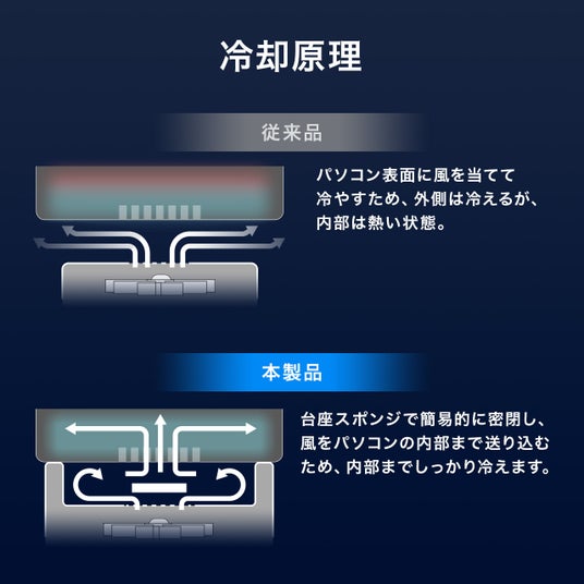従来品はパソコン表面に風を当てるだけでしたが、本製品は台座スポンジで簡易的に密閉し、風を吸気口からPC内部にまで送り込み、風が対流することで冷却性能を向上させています。