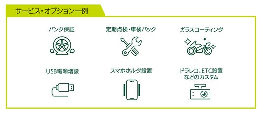 「パンクや点検などのメンテナンスを重視したい」、「外観をいつまでも綺麗に保ちたい」「ロングツーリングで便利なUSB電源やスマホホルダーをこの機会に設置したい」などお客様のバイクライフに合わせたオプションをお選びいただきます。