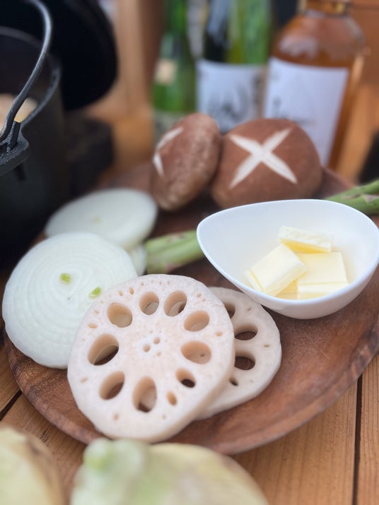 大粒なホタテを主役に、アサリ・レンコン・エノキ・しいたけ・しめじ・玉ねぎの6種素材を和風だしで味付けしました。アルミホイルに包まれた状態で焼き上げることで、素材本来の旨みをぎゅっと閉じ込め、そのままでももちろん、お酒にも合う仕上がりに。仕上げの香り付けに柚子を添えました。 ■季節のグリル焼き野菜