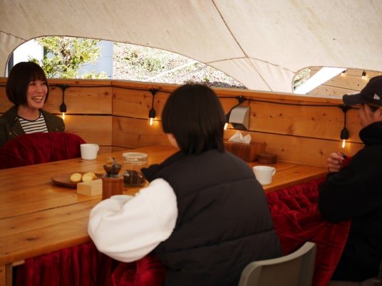 炭火で炙ったり、コーヒーに入れてアレンジしたり、ぜひお好みの食べ方でご賞味あれ。 食事スペースは冬仕様のコタツづくりに!