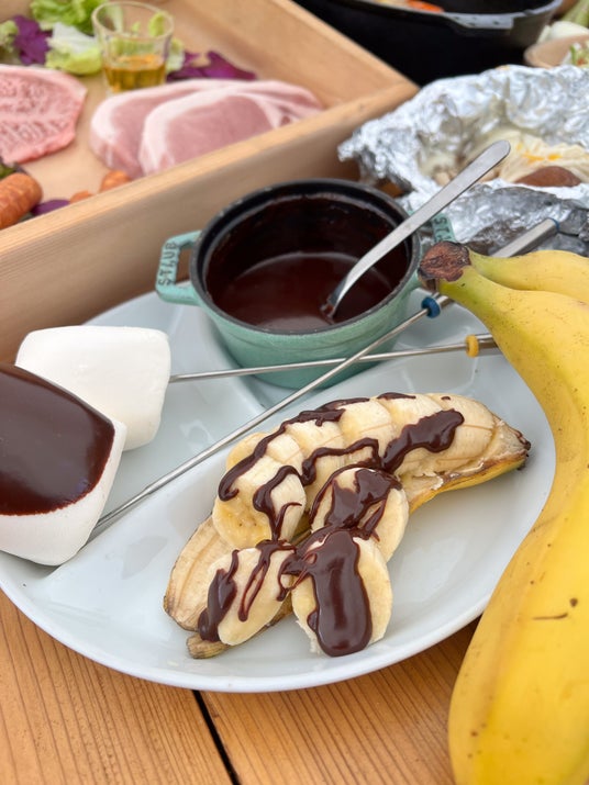 群馬県産コシヒカリと白沢の天然水を使用して炊き上げるふっくらごはんに春の味覚「たけのこ」をトッピング。備長炭を使用した円形鉄板とダッチオーブンで炊き上げることにより、香ばしいおこげもお楽しみいただけるアウトドア感満載の一品です。 ■チョコレートフォンデュスイーツセット
