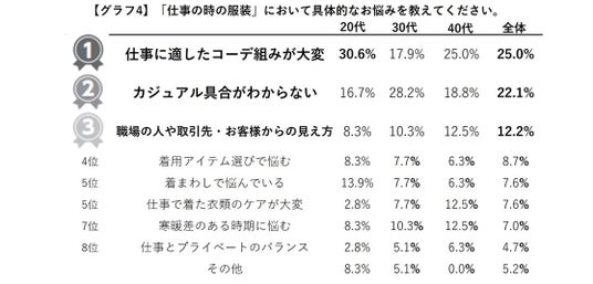 ビジネスシーンにおける『服装ストレス』に関する悩みをより具体的に調査したところ、「仕事に適したコーデ組みが大変」が25.0%と最も多く、世代別に見てみると、特に若手社員が多くを占める20代に多いことが分かりました(グラフ4)。自分に合った着こなしや選択などの、服装「チョイス」に悩む方が多いことが明らかになっています。客観的な視点を欲している人、コーディネートを楽しめていない人が多く存在しているようです。