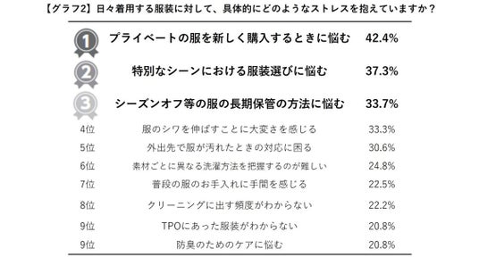 女性の「服への悩みに関する意識調査」をしたところ、服の「ケア(お手入れ)」と「チョイス(選択)」という2つの悩みに大きく分けることができ、これらにストレスを感じていることが明らかになりました(グラフ1)。具体的な服の「ケア」に関する悩みには、「服のシワを伸ばすことが大変」「素材ごとに異なる洗濯方法がわからない」、「チョイス」に関しては「プライベートの服を新しく購入する際の選択」「TPOにあった服装がわからない」などが上位の悩みであることが分かりました(グラフ2)。