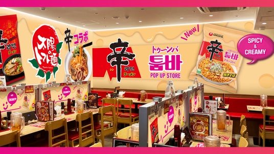 株式会社農心ジャパン(本社:東京都千代田区、代表取締役社長:金大廈)は、トマトラーメンの専門店「太陽のトマト麺」(運営:株式会社一品香)と実施中のコラボフェアにおける新たな取り組みとして、3月1日(土)から期間限定POPUP「辛ラーメン トゥーンバ meets 太陽のトマト麺」を開催します。同POPUPは、辛ラーメンが青山オーバルビル店を店舗ジャック。3月31日(月)までの間、SNS映えする全面“辛ラーメン トゥーンバ仕様”の店舗で期間限定コラボメニュー第2弾「太陽のヘムル“辛”トゥーンバトマト麺」をはじめとする、太陽のトマト麺の各種メニューをおたのしみいただけます。また、コラボを記念して、3月3日(月)~3月9日(日)には辛ラーメン・太陽のトマト麺公式Xにおいてキャンペーンを開催。両アカウントをフォローし、キャンペーン投稿をリポストした方の中から抽選で10名様に、話題の新製品「辛ラーメン トゥーンバ」や「太陽のトマト麺オリジナルどんぶり(非売品)」が当たります。