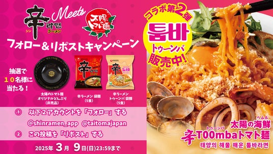 「辛ラーメン×太陽のトマト麺」コラボを記念して、Xキャンペーンを開催。辛ラーメン・太陽のトマト麺公式XをWフォローの上、キャンペーン投稿をリポストしてくれた方の中から、抽選で10名様に新製品「辛ラーメン トゥーンバ」や「太陽のトマト麺オリジナルどんぶり(非売品)」が当たります。