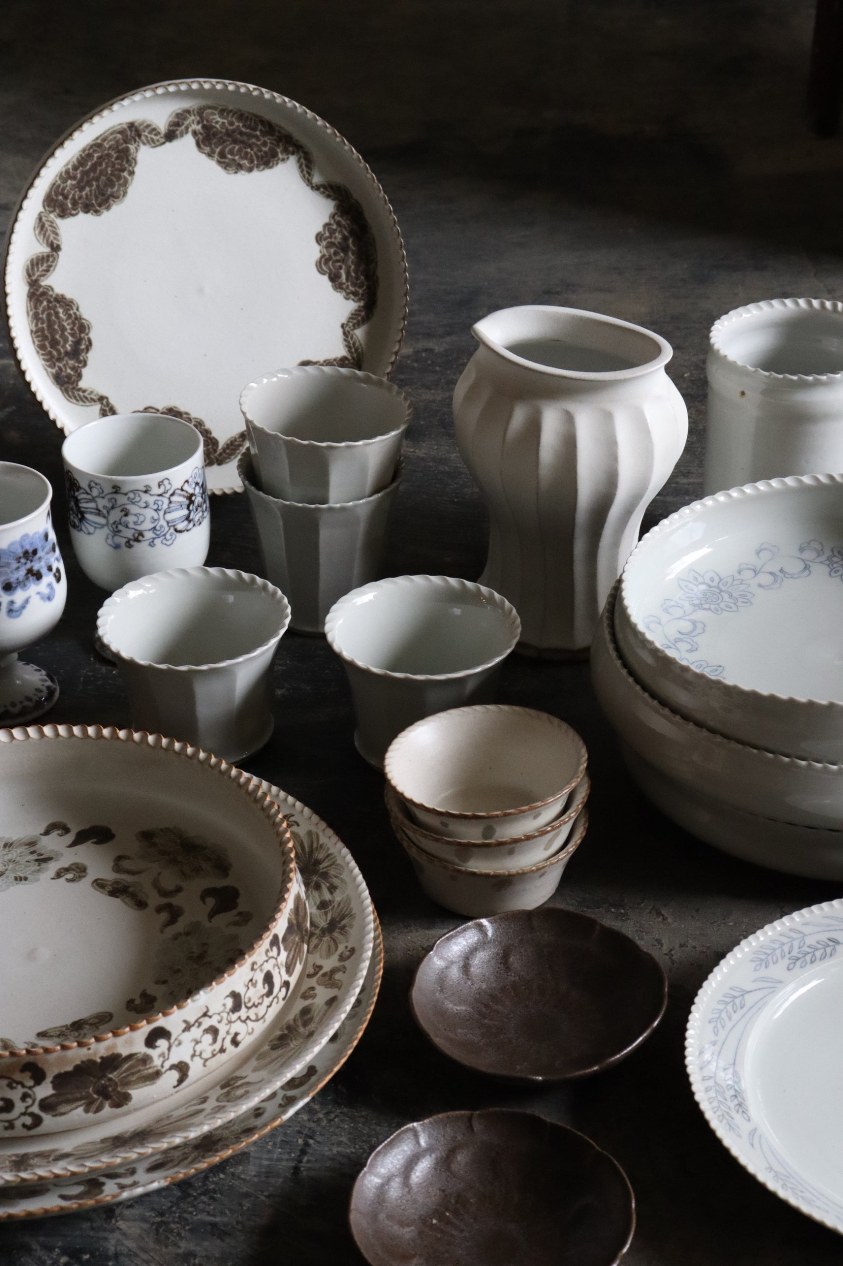 「更紗」「仏教美術」「シルクロード」等からインスピレーションを得ることが多く、それらの作品をよく観察し、自分の中で再構築することで、単に古美術の柄を写すのではなく、独自のアレンジを加えた器などを制作しています。