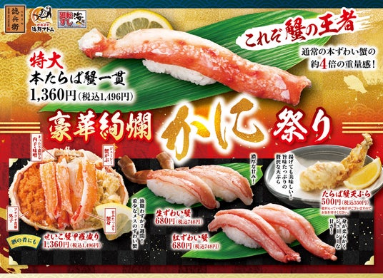 本格グルメ廻転寿司 にぎりの徳兵衛、海鮮アトムなど45店舗、年末年始は“蟹の王者”特大本たらば蟹や、希少なせいこ蟹を贅沢に楽しもう!『豪華絢爛 かに祭り』2024年12月17日(火)~1月初旬