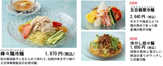 新料理長の新たな感性を取り入れた新作『五目翡翠冷麺』と『冷やし担々麺』が登場します。 提供期間 5月26日(月)~ 9月30日(火)
