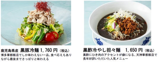 ■博多華都飯店 毎年定番の「鹿児島県産 黒豚冷麺」が今年も登場します。新たに、移転前の天神華都飯店で提供していた人気の「黒酢冷やし担々麺」もお楽しみいただけます。ランチタイムは点心とのセットもご用意しております。 提供期間 5月26日(月)~ 9月15日(月)