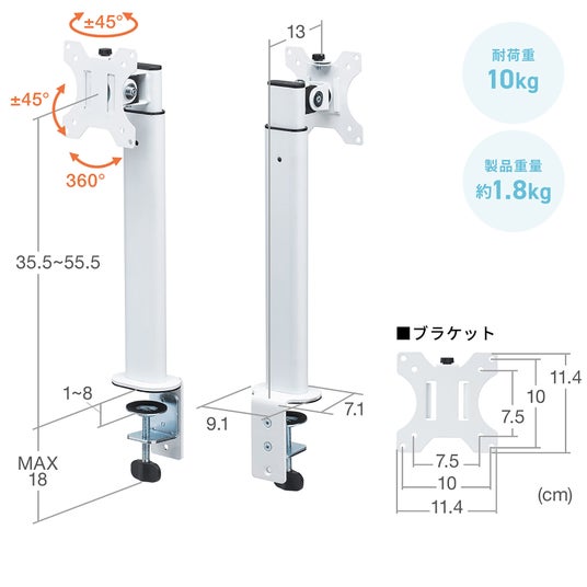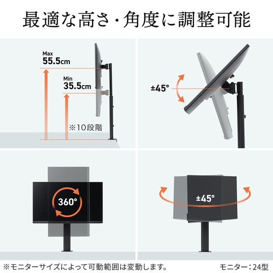 35.5~55.5cmの高さ調整が可能なため、最適な目線の高さにディスプレイを配置できます。さらに、画面の向きを上下左右±45度調整でき、ディスプレイの360度回転にも対応。姿勢に合わせた自由なカスタマイズが可能です。