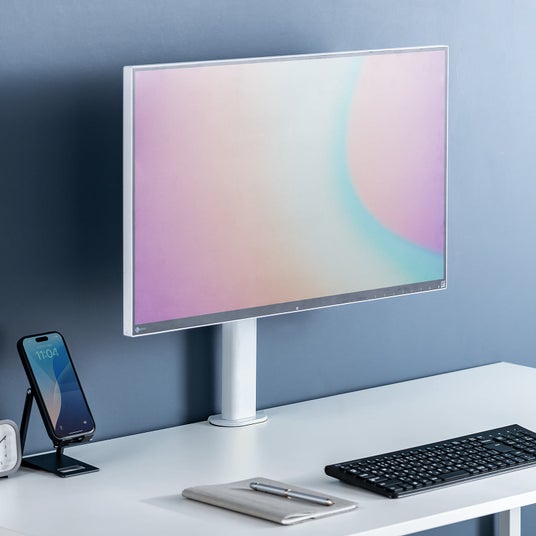 クランプ式で簡単に設置できるモニターアーム。従来のモニタースタンドに比べて、デスク上のスペースを大幅に節約できます。キーボードや書類を置くスペースを確保し、作業効率を向上させることができます。