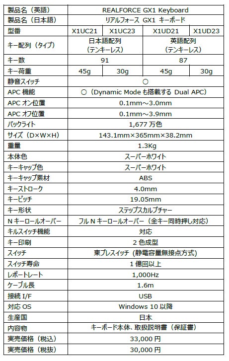 2つ目は、PCゲーミング用のREALFORCE GX1 キーボードのホワイトバージョン(日本語配列 キー荷重45g型番: X1UC21 / 日本語配列 キー荷重30g型番: X1UC23 / 英語配列 キー荷重45g型番: X1UD21 / 英語配列 キー荷重30g型番: X1UD23)で、実勢価格は33,000円(税込)です。