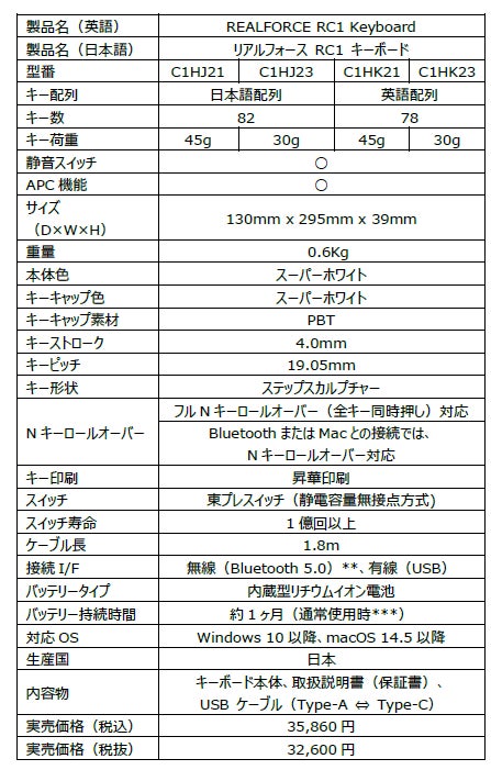 東プレ株式会社(代表取締役社長:山本 豊/本社所在地:東京都中央区日本橋)は、ホワイトバージョンのキーボード新製品2種8製品を同社のラインナップに追加します。1つ目はREALFORCE RC1キーボードのホワイトバージョン(日本語配列 キー荷重45g型番: C1HJ21 / 日本語配列 キー荷重30g型番: C1HJ23 / 英語配列 キー荷重45g型番: C1HK21 / 英語配列 キー荷重30g型番: C1HK23)で、実勢価格は35,860円(税込)です。