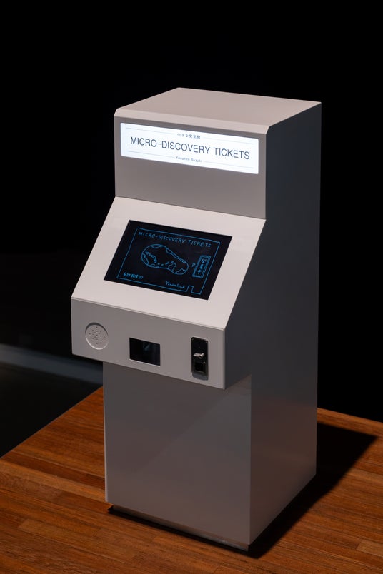 注目の新作《小さな発見機》は新幹線などのチケットを買う時、「ただ今、発券しています」と発券機から聞こえた「発券」という言葉を「発見」と間き違えたことから生まれた、本展を象徴するような作品。