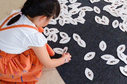 《まばたきの葉》の近くには、自分で目の絵を描ける体験コーナーも!描いた目を舞い上がらせる事もできます。来場者が作品に参加する事で、新たな発見が生まれる作品です。