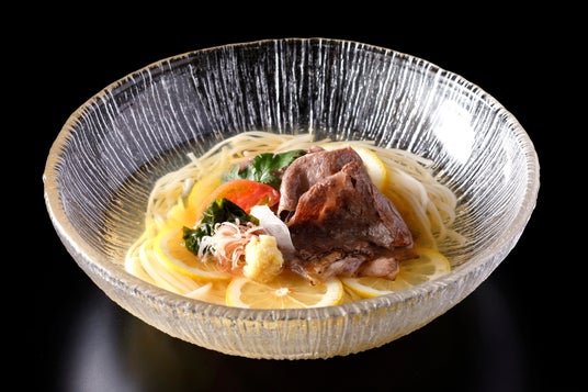 稲庭うどんは、ディナータイムなら単品でも注文が可能。喉ごしの良い稲庭うどんの上には、鳥取和牛の炙り焼きをトッピング。レモン風味の麹ソースをあわせることで、爽やかなレモンと麹のまろやかさが香ばしい鳥取和牛の脂と溶け合い、新感覚の冷製うどんに。さっぱりしながらも、食べ応えのある逸品をお愉しみください。 『鳥取和牛 冷製稲庭うどん』 ¥6,800 [店舗]日本料理「KATO'S DINING & BAR」(ガーデンコート ロビィ階)