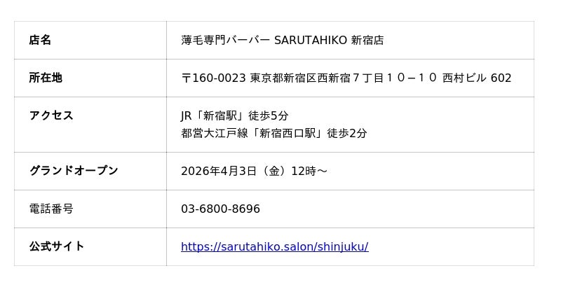 株式会社SARUTAHIKO(所在地:東京都新宿区、代表取締役:佐々木善一)は、2026年4月3日(火)、西新宿に『薄毛専門バーバー SARUTAHIKO 新宿店』をグランドオープンいたします。また、オープンに先駆け、3月17日(火)よりプレオープンを実施し、予約受付を開始いたします。