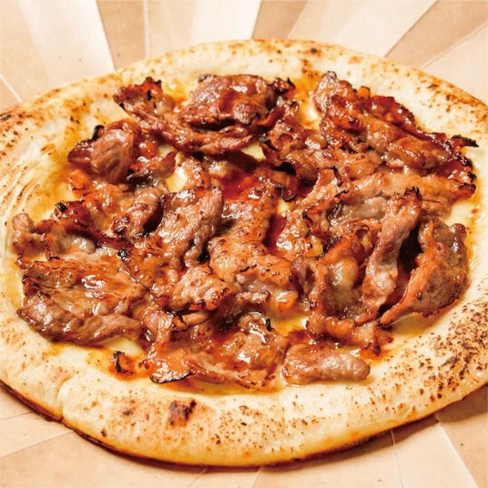 東京チカラめしのお肉たっぷり、パンチを効かせた背徳のピザです。
