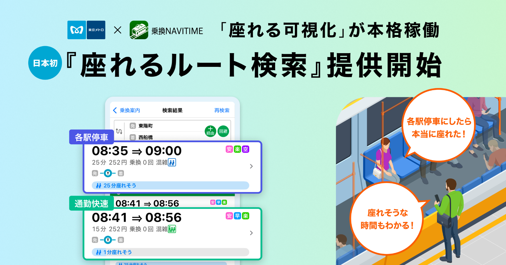東京地下鉄株式会社(代表取締役社長:小坂 彰洋、本社:東京都台東区、以下「東京メトロ」)と、株式会社ナビタイムジャパン(代表取締役社長:大西 啓介、本社:東京都港区、以下「ナビタイムジャパン」)は、車両データ等から推定した「着座確率」(=座りやすさ)を活用し、移動の快適性を最大化する『座れるルート検索』および『座りやすい号車案内』を2026年3月30日(月)から『乗換NAVITIME』アプリの有料会員限定で本格提供いたします。