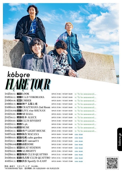 東京・府中発ギターロックバンド”kobore”が、11月27日(水) にリリースするNew Album「FLARE」を提げて巡る全国ツアー「FLARE TOUR 2025」の対バンゲストを発表した。