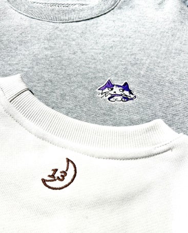 胸元には「シムスル君」、襟元には「月」「13」の刺繍が入ったスウェットです。