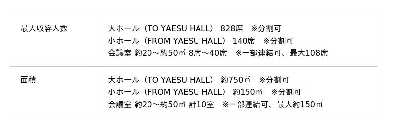 TOFROM YAESU TOWERの5階・6階に設置される「東京建物 ぴあ カンファレンス」は、最大828席収容可能な大ホール「TO YAESU HALL」、最大140席収容可能な小ホール「FROM YAESU HALL」の2つの平土間ホールと様々なシーンでご活用いただける10の会議室で構成されます。