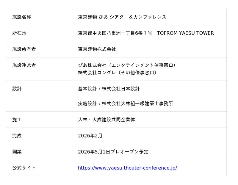 ぴあ株式会社(本社:東京都渋谷区、代表取締役社長 矢内 廣、以下「ぴあ」)と、株式会社コングレ(本社:東京都中央区、代表取締役社長 武内 紀子、以下「コングレ」)が共同で運営する劇場・カンファレンス施設「東京建物 ぴあ シアター&カンファレンス」(以下「本施設」)が、東京駅前の大規模複合施設TOFROM YAESU TOWER(トフロム ヤエス タワー)※1 内に2026年5月1日にプレオープンします。本施設では、ぴあとコングレが二社間の協業を通じてエンタテインメントとビジネスの両軸での利用を促進してまいります。