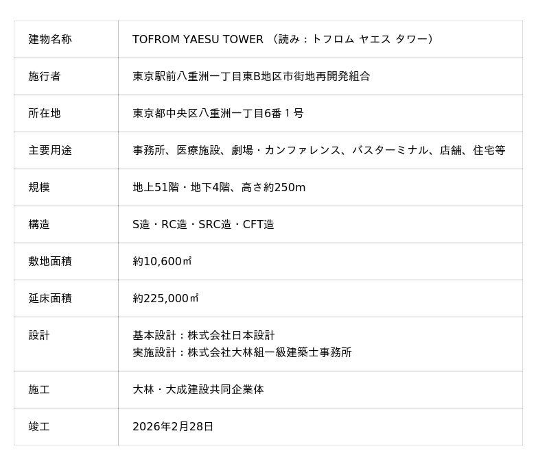 TOFROM YAESU TOWERは、2026年2月28日に竣工した、東京駅八重洲口前に所在する地下4階、地上51階の大規模複合ビルです。八重洲地下街(ヤエチカ)を介し東京駅に直結し、オフィス、商業施設、劇場・カンファレンス、バスターミナル、医療施設など多様な用途で構成され、国際都市東京の玄関口にふさわしい都市機能の強化と国際競争力の向上に貢献します。名称の「TOFROM」は、英語の「TO」と「FROM」を組み合わせた造語で、日本中、ひいては世界中のヒト・モノ・コトがここに集まってつながり、ここから多様な価値が生み出され、発信されていく場所になってほしいという思いが込められています。
