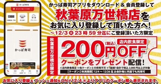 公式アプリ(https://www.kappasushi.jp/app.html)をダウンロード&会員登録いただき、11月15日(金)から12月3日(火)23時59分までに『秋葉原万世橋店』をお気に入り登録いただくと、12月4日(水)から12月26日(木)まで、お会計毎に何度でもご利用いただける“店内飲食限定200円(税込)OFFクーポン”をプレゼント配信いたします。